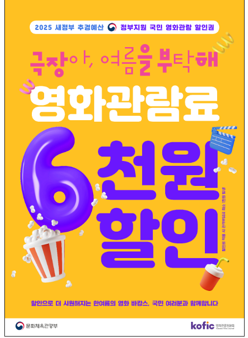 무더운 여름, 영화관에서 시원하게 피서 즐기실 분들 주목! 영화관 6천 원 할인권으로 영화 관람 부담을 확 줄여보세요. 7월 25일부터 전국 영화관에서 총 450만 장의 할인권이 풀린다고 하니, 놓치지 말고 꼭 챙기세요!